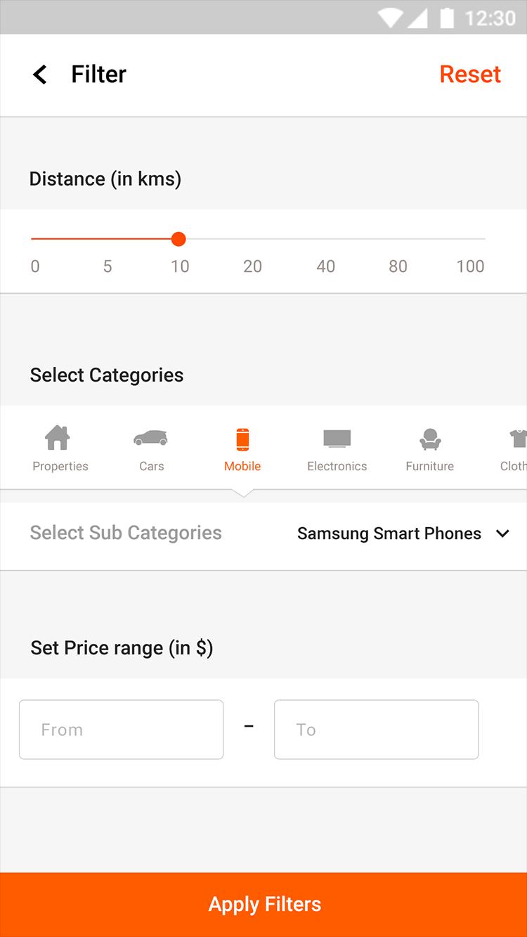 Os usuários podem alterar o local facilmente e podem aplicar os filtros. Uma lista do produto é exibida após selecionar a categoria do produto.