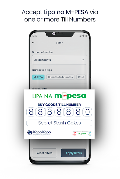 Podemos fornecer um ou vários números M-Pesa até o seu negócio. Seus clientes não pagam cobranças ao pagar a Kopo Kopo até que números e fundos sejam creditados instantaneamente à sua conta Kopo Kopo . Como negócio, você paga 0,55% para aceitar um pagamento LIPA Na M-Pesa, limitado no KSH 200. Os pagamentos abaixo do KSH 200 são gratuitos. Diga adeus a dinheiro em trânsito e vazamento, juntando-se à revolução digital!