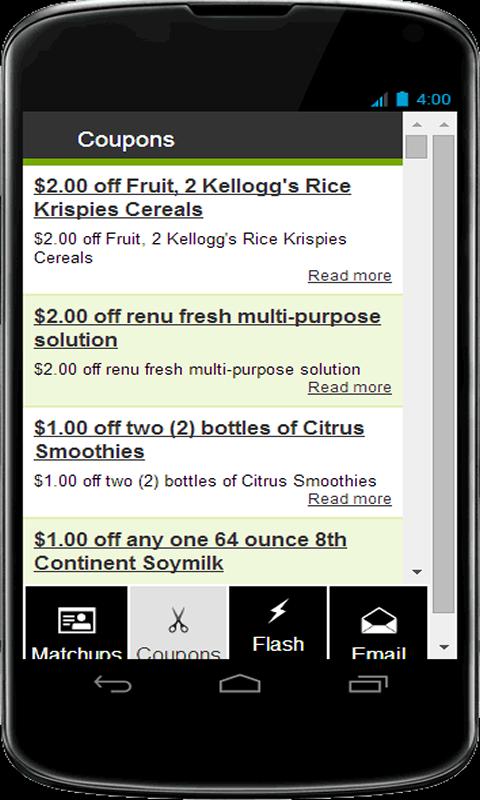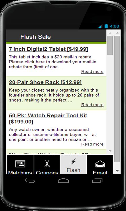 Esqueceu sua lista de compras em casa? Quer sempre ter as melhores ofertas e confrontos de cupom com você? Os usuários do Android podem baixar nosso aplicativo móvel e manter todas as ótimas partidas de compras, cupons e vendas com eles quando estão em movimento. Se você esqueceu sua lista de compras, não é grande coisa, basta abrir o aplicativo para encontrar as melhores ofertas e cupons para a loja em que você está !! A melhor parte é que é totalmente gratuito e, se você achar útil, pedimos/esperamos que você o compartilhe com seus amigos. Você pode até enviar mensagens de texto para o aplicativo de dentro do aplicativo para seus amigos se achar útil e útil! Por favor, comente aqui e nos dê algum feedback e diga -nos o que você pensa!