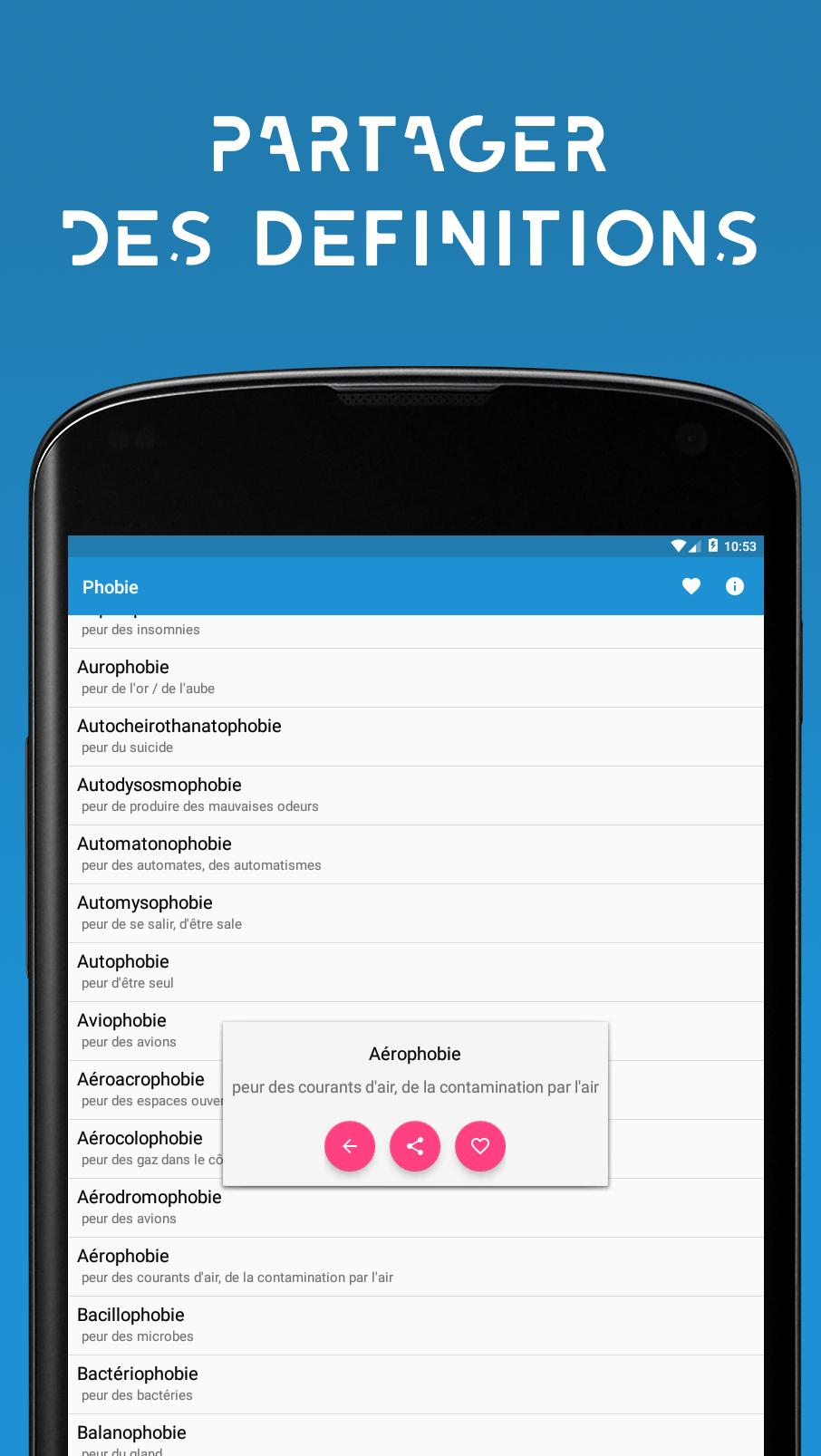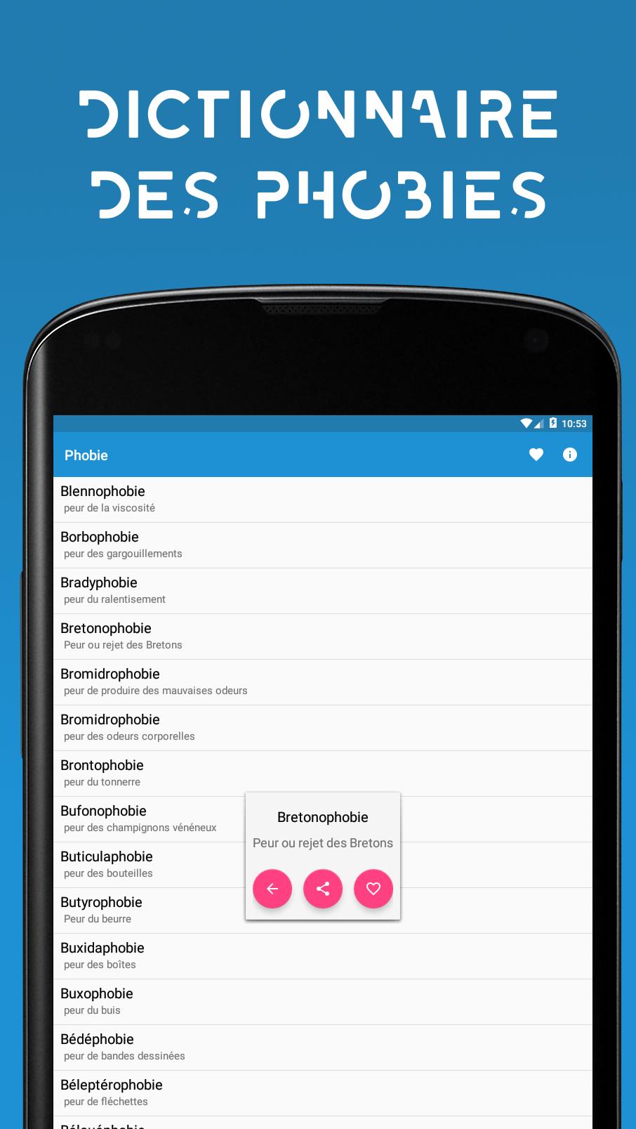 A interface Phobie é fazer para todas as faixas etárias para facilitar o uso, você também pode compartilhar por meio de mensagens ou outros aplicativos uma Phobie e sua definição.