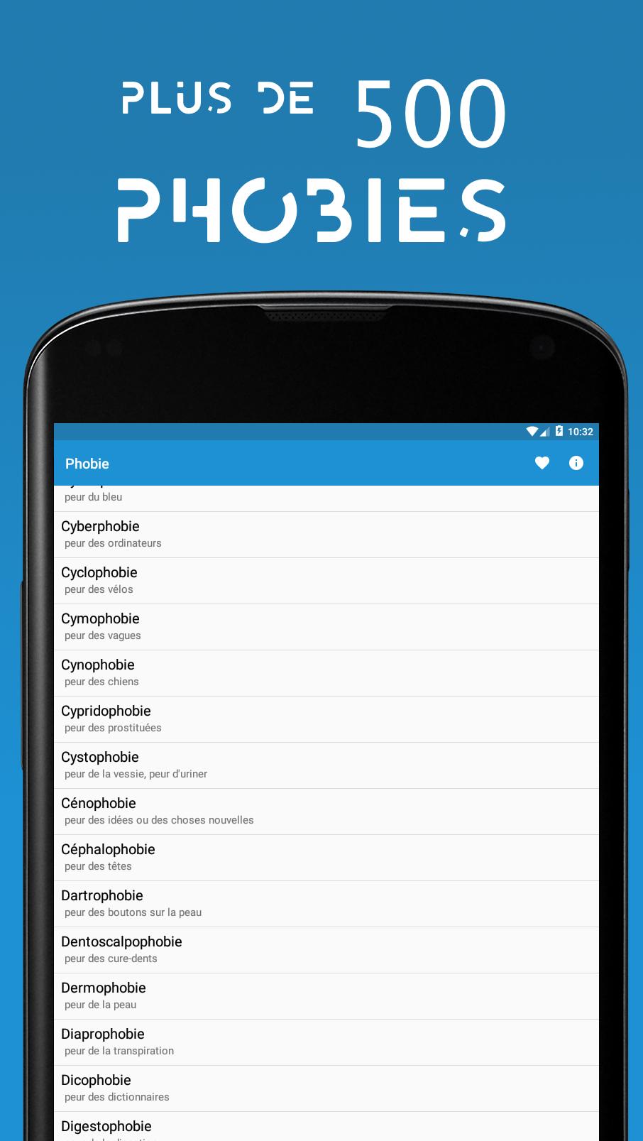 Phobie é um dicionário on -line que coleta nada menos que 500 Phobie s com definição, rápida, simples e leve, possui um mecanismo de pesquisa inteligente que oferece resultados específicos.