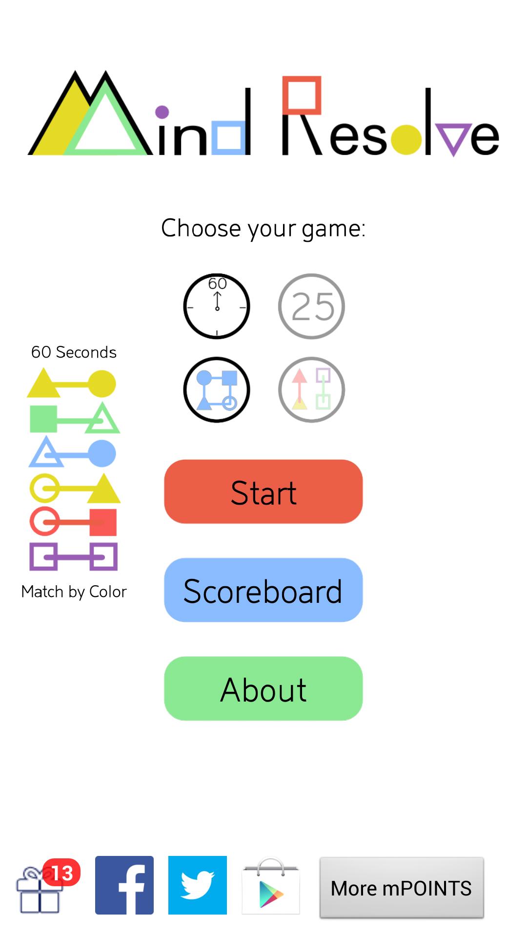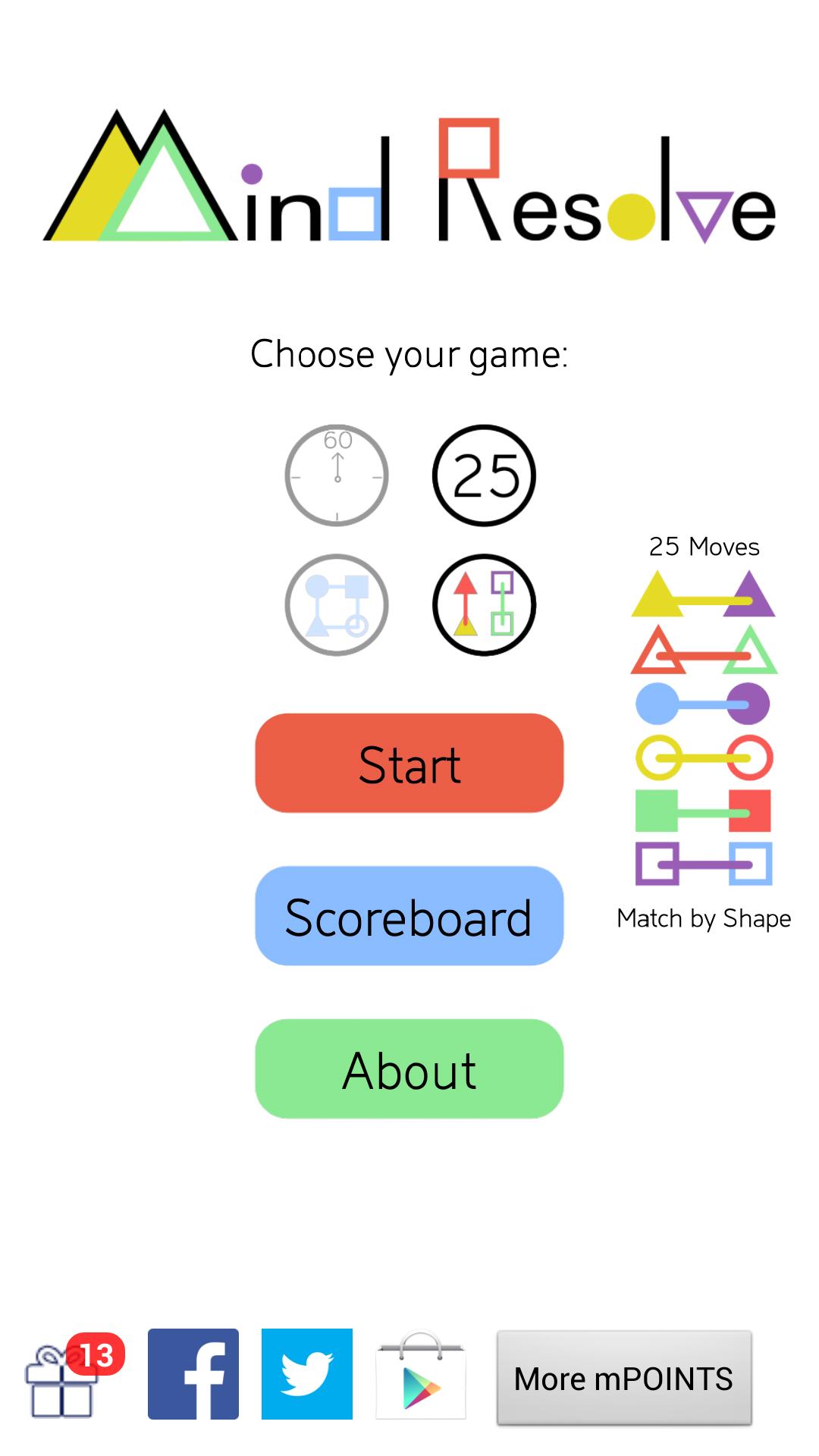 " Mind Resolve " é um jogo divertido, surpreendentemente desafiador e incrivelmente viciante. Você pode reproduzir "Match By Shape" ou "Match By Color" em um dos dois modos, "cronometrado" ou "Moves", no qual você corresponde a uma combinação de 6 formas e 5 cores, dependendo do jogo e do modo.