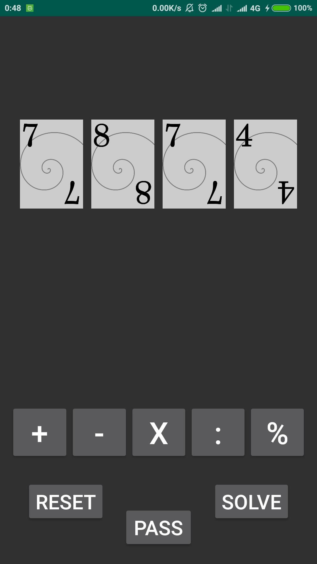Este é um jogo em que você obtém um número aleatório de quatro e precisa usar operadores (adição, subtração, multiplicação, divisão, modulo) para alcançar os 24, os objetivos deste jogo. Se não for possível, não se preocupe, você pode passar a rodada e obter os pontos se ele realmente não puder ser resolvido.