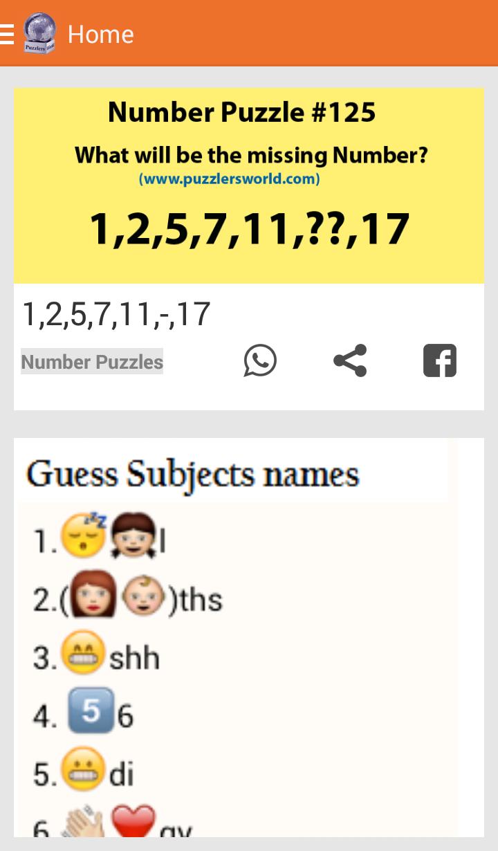 Todo o tipo de quebra -cabeças lógicos, quebra -cabeças de entrevistas, quebra -cabeças de números, quebra -cabeças de matemática, quebra -cabeça de hackers, teasers cerebrais ou enigmas de sequência com respostas.