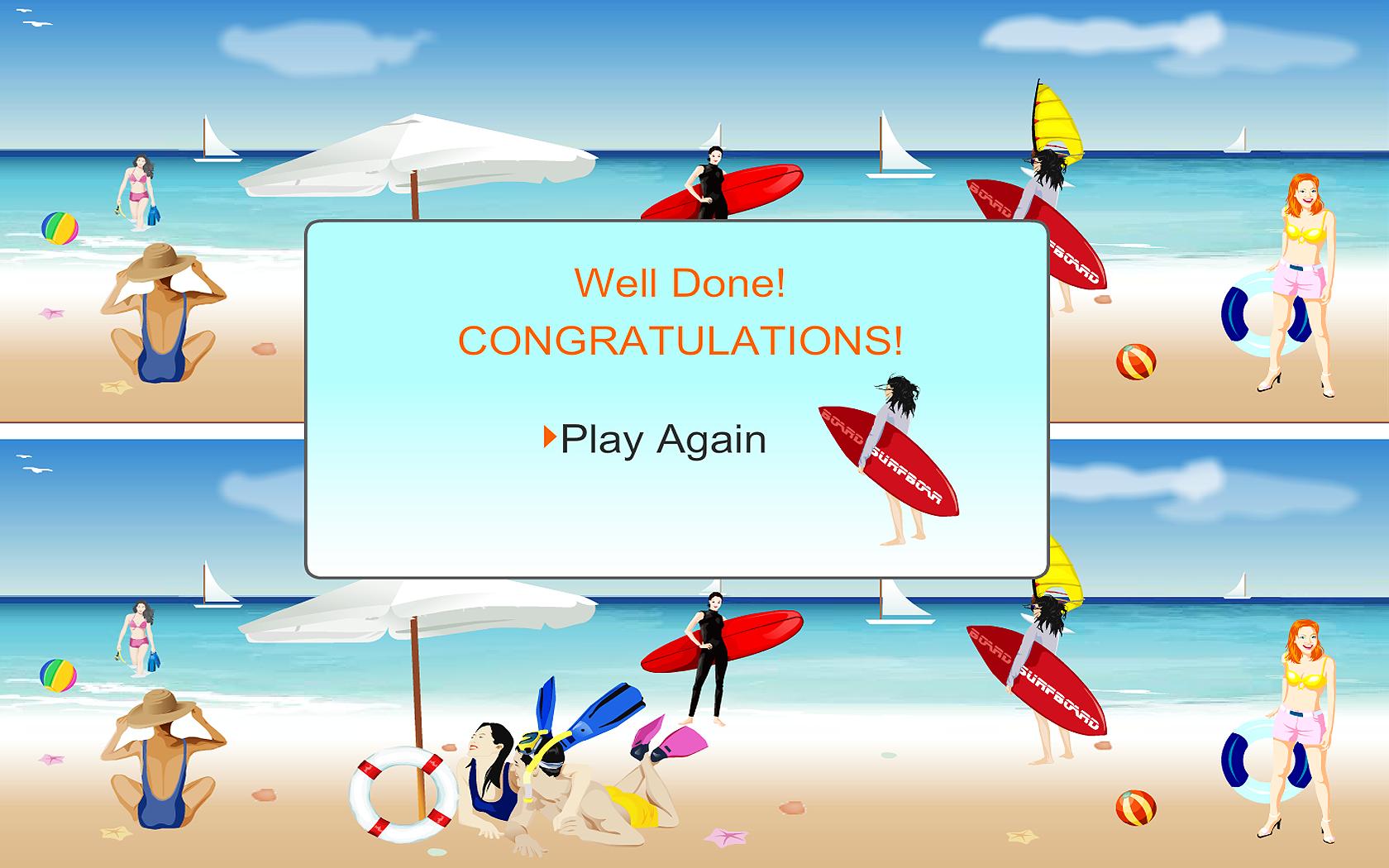 It is summer, the sun shines brightly and everyone is having a great fun at the beach. Find 10 Differences between these two pictures apparently identical. With patience and attention you will be able to find differences only if you look carefully study the two images. Play find 10 differences on the beach game. Now you must quickly find 10 differences between this 2 animated movies. Take a closer look at both images and click on the element you think is different. You will Finnish the game when all differences are found before time to goes out. Good Luck and Enjoy!