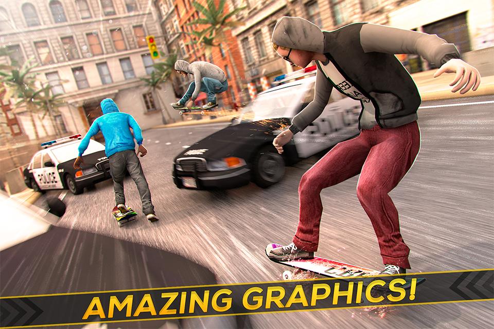 Não importa se você é um menino ou uma menina! Você terá a chance de evitar a polícia da rua e se tornar um skatista legal! Os carros da polícia estão distribuídos aleatoriamente, fazendo o skatista lúpulo em seu tabuleiro e começa a esquivar -se dos carros da polícia!