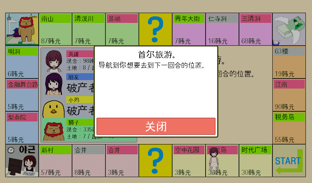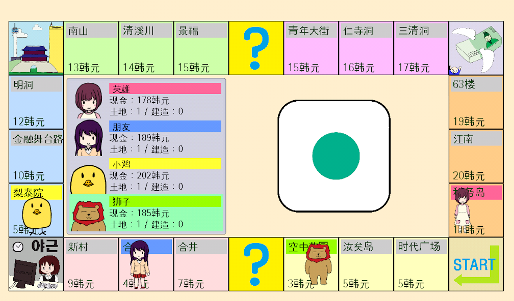 - Enrole os dados e compre terras, construa o prédio. Você deve reunir muito dinheiro e quebrar jogadores inimigos.