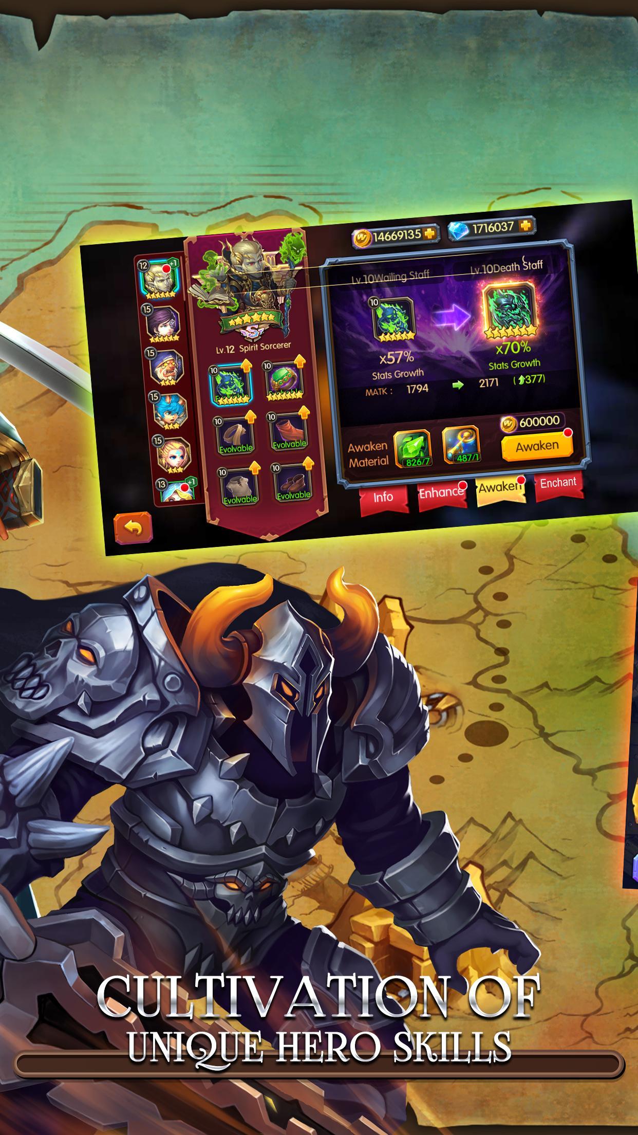 -Cuber um baralho personalizado usando heróis e cartões mágicos com habilidades únicas. Atualize cada herói e cartão mágico para se tornar mais forte.