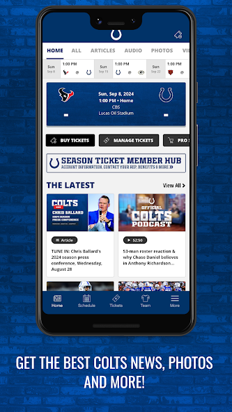 - Расписание - приложение Colts предлагает легкий доступ к полному расписанию и вариантам покупки билетов.