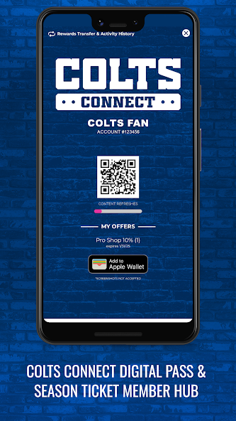 - Colts Connect - Поклонники могут использовать свое членство, получив доступ к Colts Connect Pass через приложение Colts, чтобы управлять своими пищами, напитками и товарами, скидками Colts Pro, доступа к эксклюзивным событиям и многим другим.