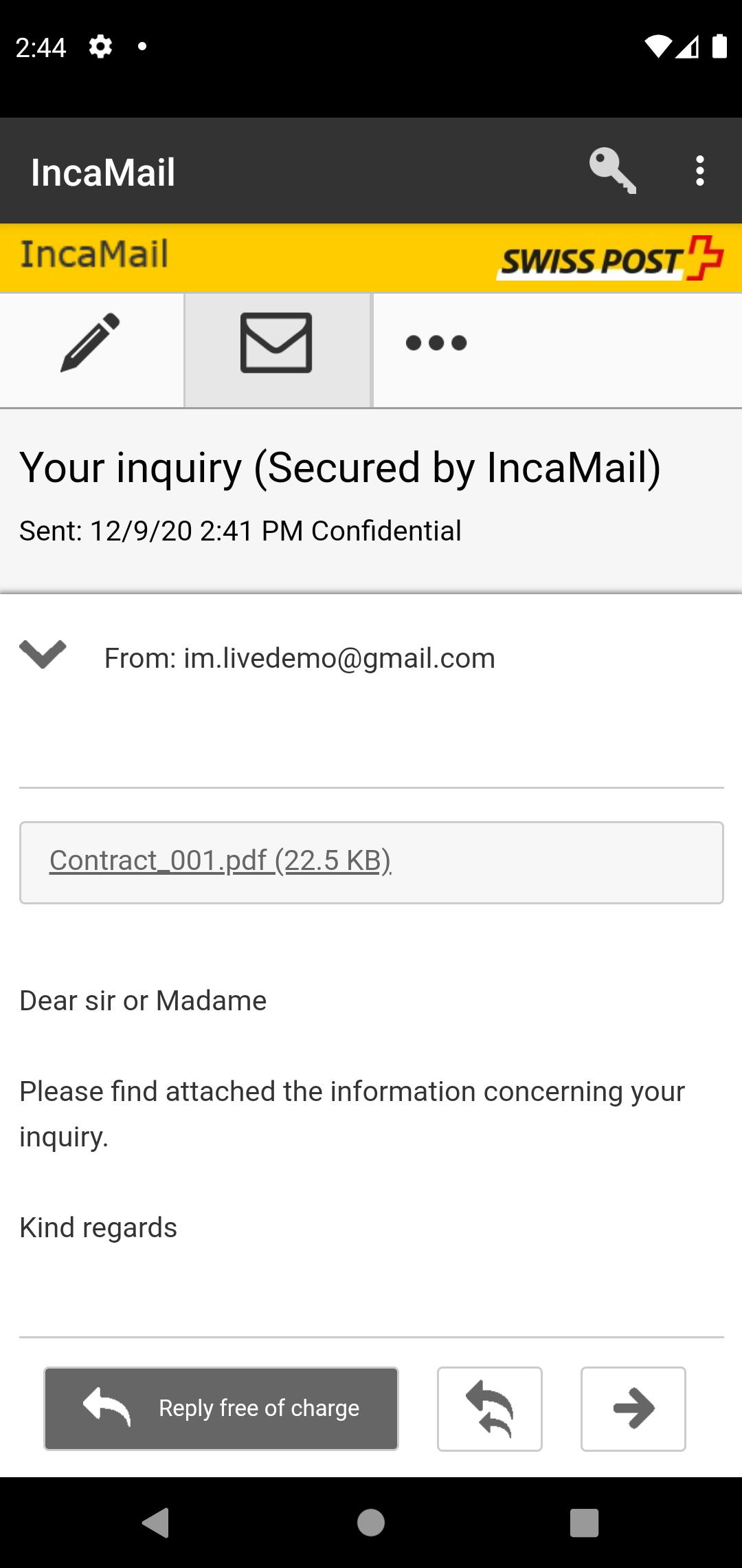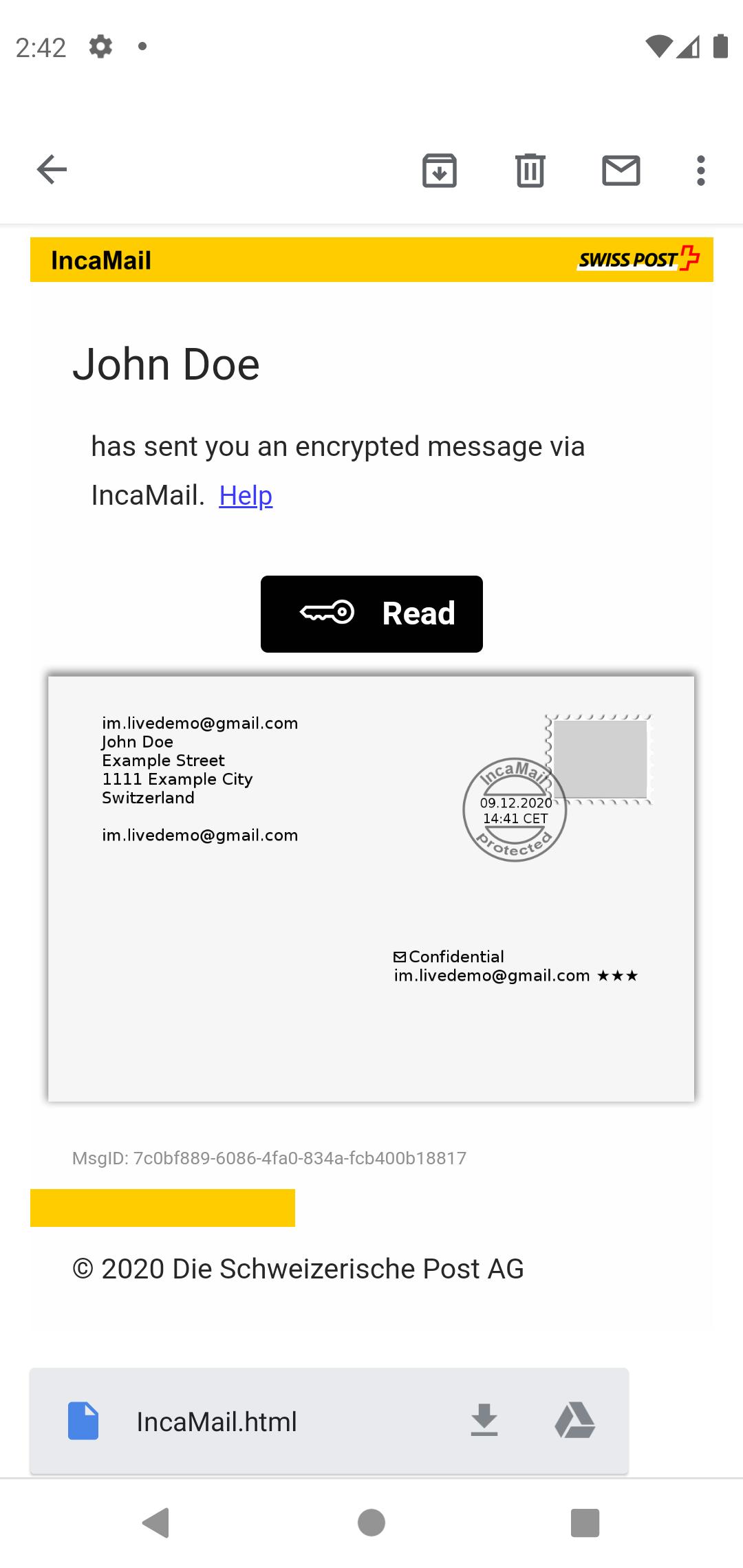 На последних смартфонах сообщения IncaMail открываются непосредственно в почтовом клиенте (например, в приложении Gmail). Это делается с использованием кнопки «Читать» (если доступно) или путем открытия IncaMail .html.
