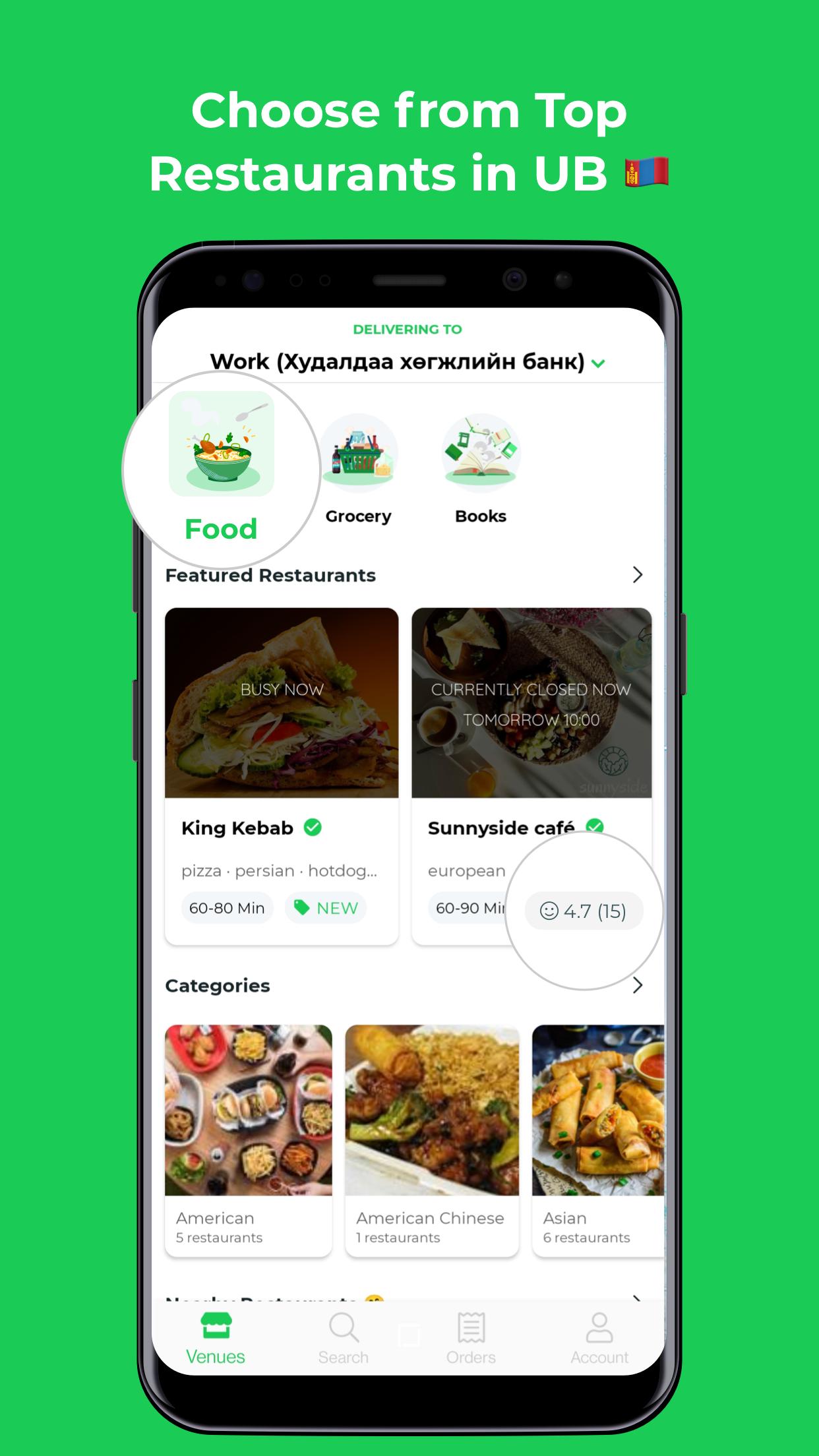 Songo.mn позволяет вам заказать еду из более чем 100 самых популярных ресторанов в Улаанбаатаре до вашей двери. В дополнение к удивительному выбору еды, Songo.mn доставит продукты, вино и напитки, хлебобулочные изделия, цветы и сухость.