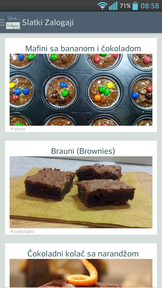 Slatki zalogaji - recepti - это приложение, которое содержит рецепты конфеты, большое количество из них, есть пирожные, пирожные и пироги. Каждый день мы отдельно откладываем для вас новый рецепт торта и основание рецептов торта, торт и пирог будут время от времени азуризируются. Быть выбранным наиболее вкусными рецептами для печенья, пирожных и пирогов.