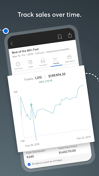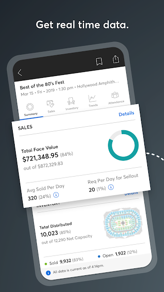 • Продажи: Проверьте выручку от продаж в режиме реального времени, включая прорывы по уровню цены и тип билета.