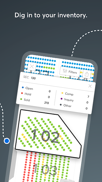 • Инвентарь: если на вашем мероприятии есть интерактивная карта сидений, мы можем обслуживать ее на вашем мобильном устройстве. Пан и масштабирование вокруг места проведения, чтобы проверить статус сиденья и другие детали инвентаризации.