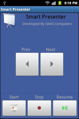 Smart Presenter позволит пользователям плавно управлять своими слайдами, используя приложение Android через Wi -Fi. С Smart Presenter пользователь может ориентироваться среди своих слайдов, используя свой смартфон Android. Поддерживаемые операции включают в себя переход к следующему или предыдущему слайду, презентацию остановки, презентацию резюме и начало презентации с самого начала. Чтобы использовать это приложение, пользователь также должен установить приложение на стороне сервера. Пользователь может запустить или остановить сервер за один щелчок, не нуждаясь в длительном процессе установки.