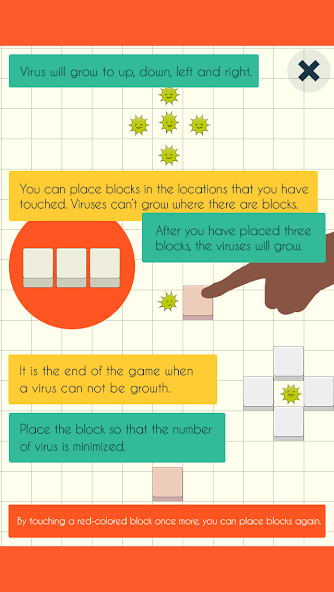 Вы можете разместить блоки в местах, которые вы коснулись. Вирусы не могут расти там, где есть блоки. После того, как вы разместили три блока, вирусы будут расти. Это конец игры, когда вирус не может быть ростом. Поместите блок так, чтобы количество вируса было сведено к минимуму.