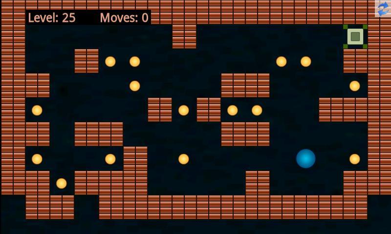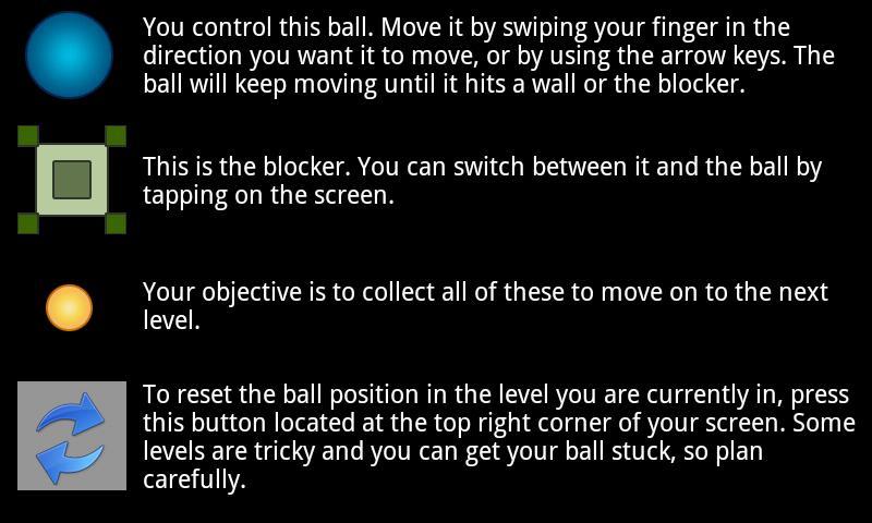 Цель игры состоит в том, чтобы собрать все желтые цели, перемещая синий мяч. Однако, когда вы двигаетесь в любом направлении, вы будете продолжать двигаться, пока не нажмете что -то. Таким образом, вы должны использовать квадратный блокатор, чтобы иногда блокировать свой путь.