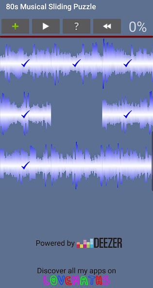 Это приложение поднимает песню среди 80-х годов и создает 8-й кусочки на основе ее выдержков. Просто решите головоломку, чтобы получить полную песню! Коснитесь значка '+', чтобы начать