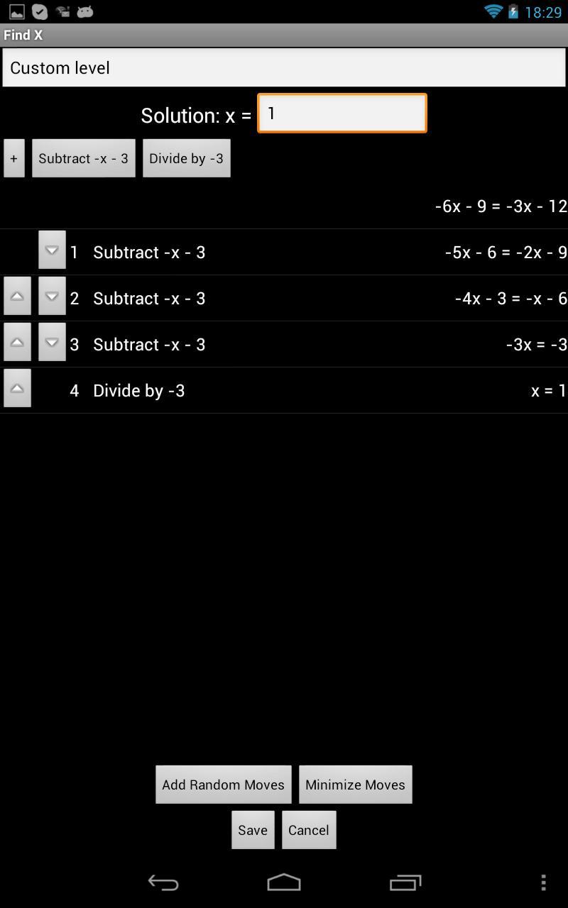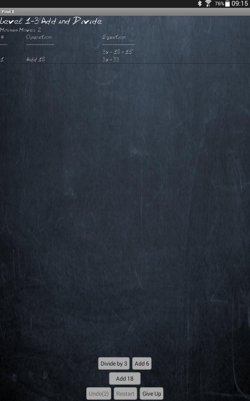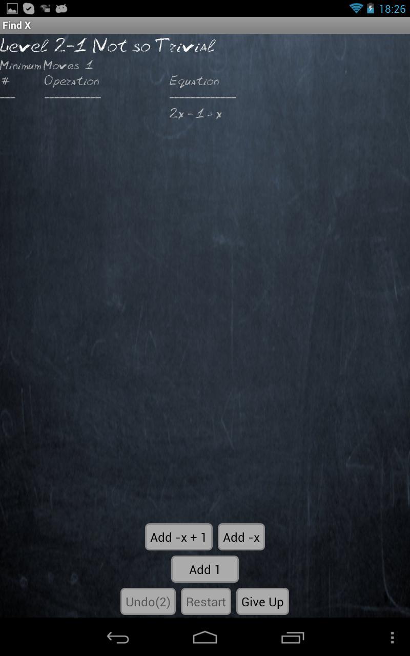 В игре представлена серия этапов, состоящих из нескольких уровней, где вы должны решить для X. Это звучит просто, если вы знаете алгебру. Тем не менее, это становится более сложной головоломкой, поскольку операции, которые вы можете применять, ограничены небольшим подмножества для каждого уровня.