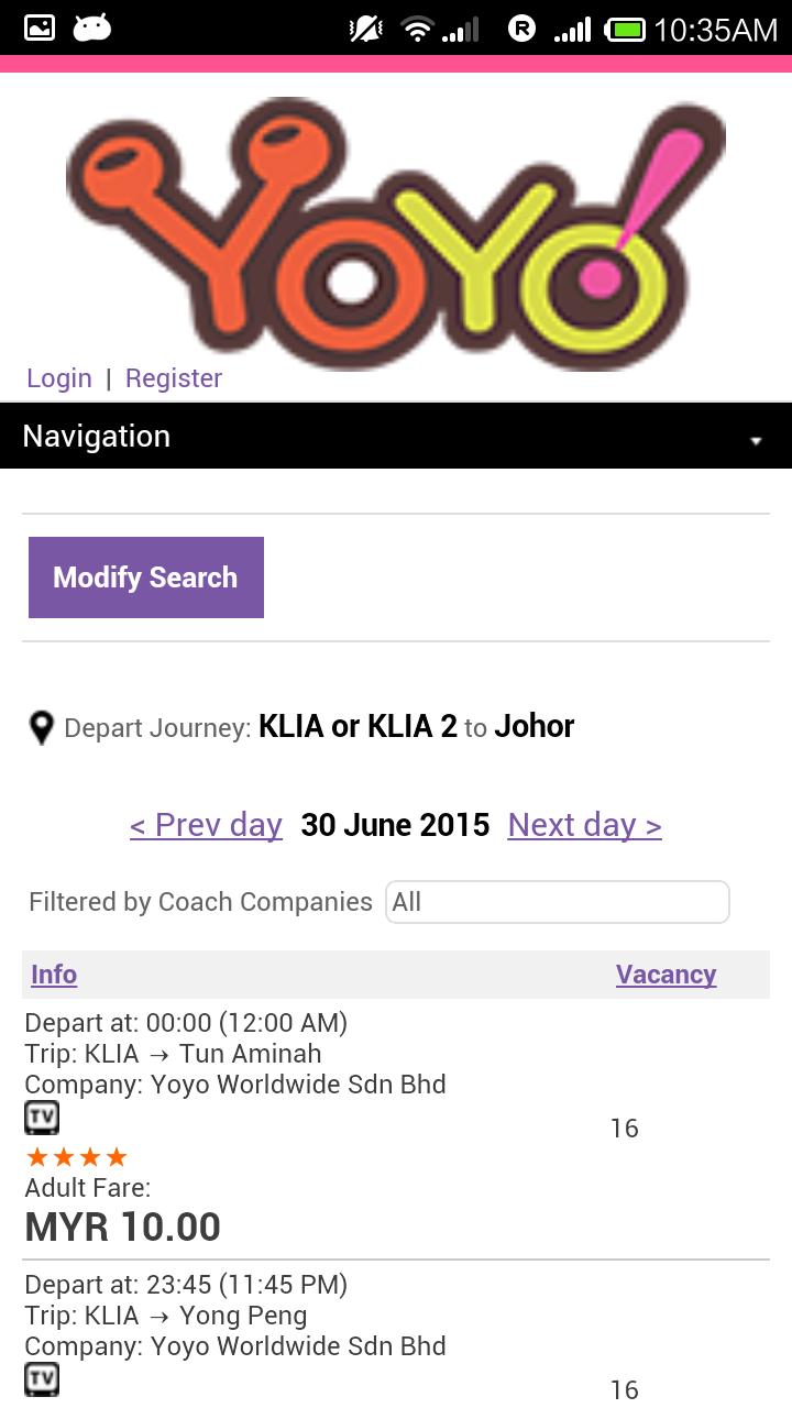 ต้องการตั๋วรถบัสด่วนในมาเลเซียหรือไม่? รับตั๋วรถบัสของคุณออนไลน์ด้วย YoYo Bus ในแอพที่รวดเร็วสะดวกและใช้งานง่าย เราเสนอตั๋วรถบัสสนามบินไปยัง & จากสนามบินนานาชาติกัวลาลัมเปอร์ (KLIA / KLIA 2)