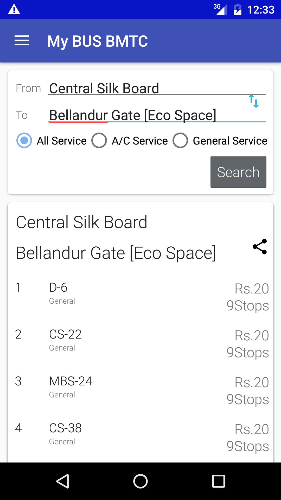 * ค้นหาด้วยหมวดหมู่ของรถบัส BMTC (AC, General)