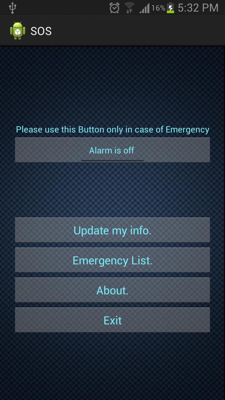 - เมื่อคุณตกอยู่ในเคสฉุกเฉินกดปุ่มปลุกเพื่อส่งข้อมูลการติดต่อและข้อมูลทางการแพทย์ของคุณผ่าน SMS และอีเมลไปยังที่อยู่อีเมลฉุกเฉินและโทรศัพท์มือถือของคุณ แอพ Cairo SOS ส่งอีเมลทุกสองนาทีพร้อมตำแหน่งที่อัปเดต
