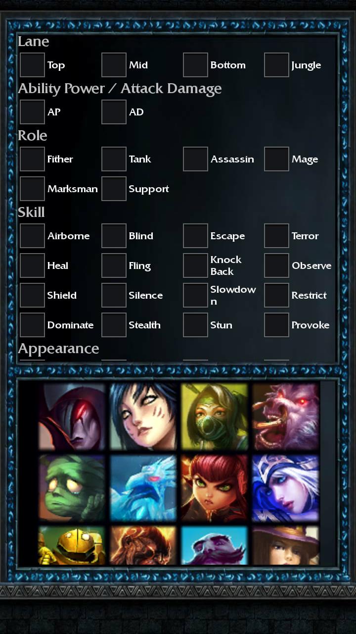 แอปพลิเคชันนี้ช่วยให้คุณเลือกแชมป์ที่คุณต้องการผ่านฐานข้อมูลและระบบกรองที่ออกแบบมาอย่างดีของเรา การสัมผัสหลายประเภทต่อไปนี้จะนำคุณไปสู่ตัวเลือกที่ดีที่สุดจากแชมป์เปี้ยนทั้งหมด