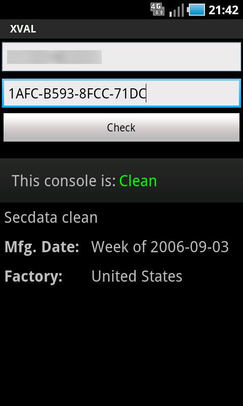 XVAL เป็นยูทิลิตี้เพื่อแสดงเหตุการณ์ความปลอดภัยที่บันทึกไว้จากคอนโซล Xbox 360 เมื่อได้รับหมายเลขซีเรียลคอนโซลพร้อมกับค่า 'X' จากข้อมูลระบบในแผงควบคุม XVAL สามารถกำหนดได้ว่าคอนโซลนั้นจะถูกตั้งค่าสถานะสำหรับการละเมิดหรือไม่ นี่คือการใช้งาน XVAL ของ Android ของ Redline99 เหมาะสำหรับการตรวจสอบ 360s ที่ใช้ในร้านค้าหรือเพื่อตรวจสอบประวัติเหตุการณ์ความปลอดภัยของคอนโซลของคุณเอง