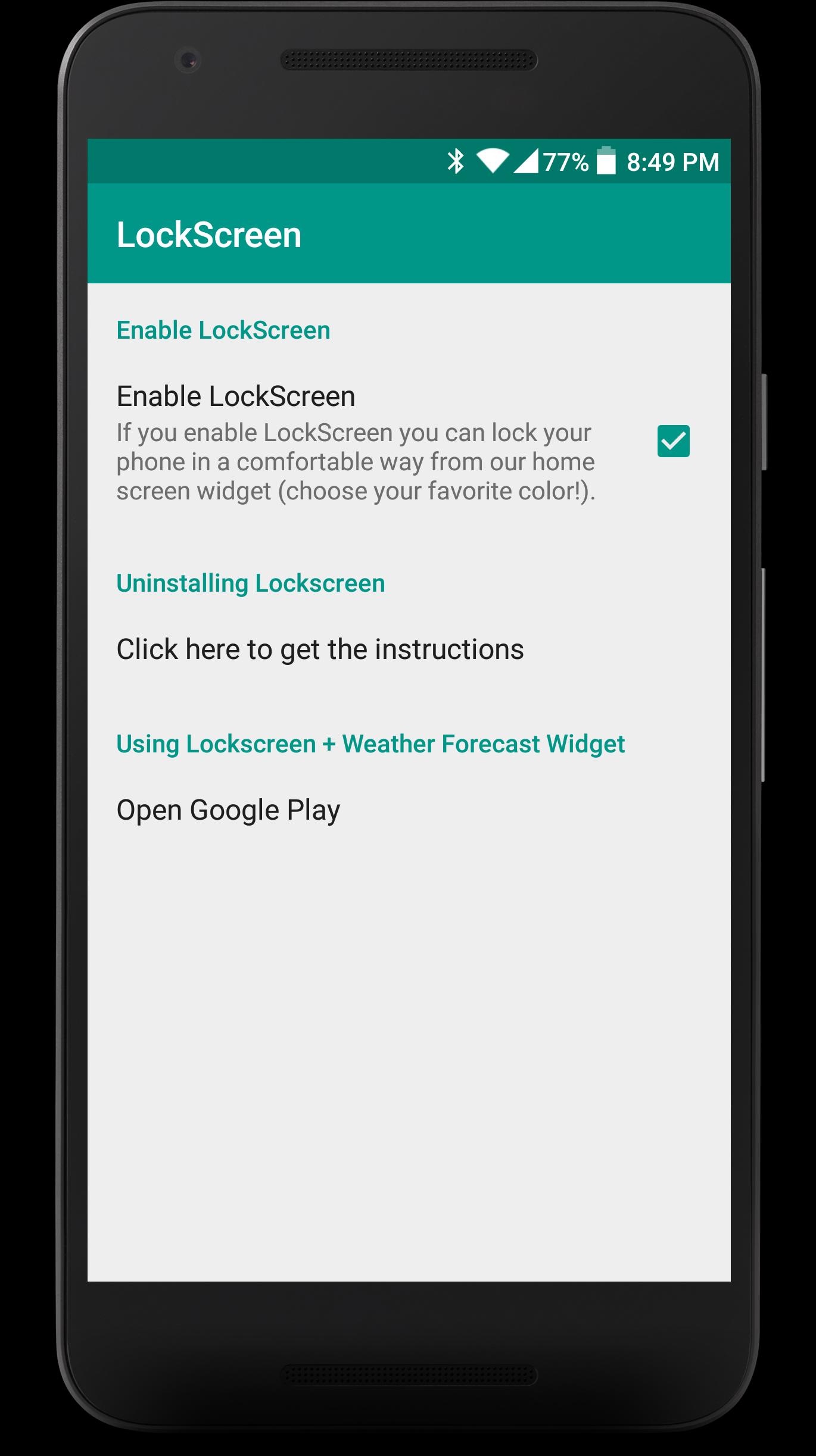 ด้วย LockScreen คุณสามารถล็อคโทรศัพท์ของคุณอย่างสะดวกสบายจากวิดเจ็ตหน้าจอหลักของเรา หลีกเลี่ยงการสวมปุ่มเปิดปิดของคุณ