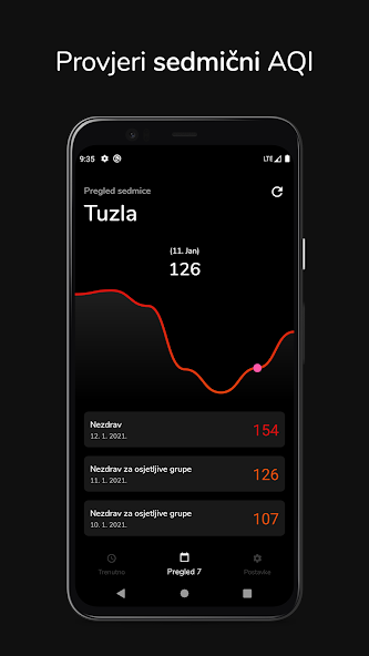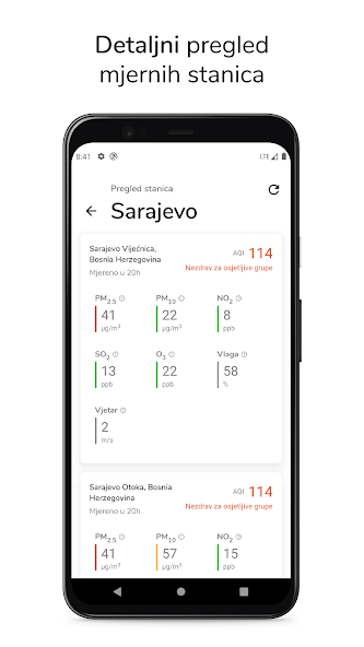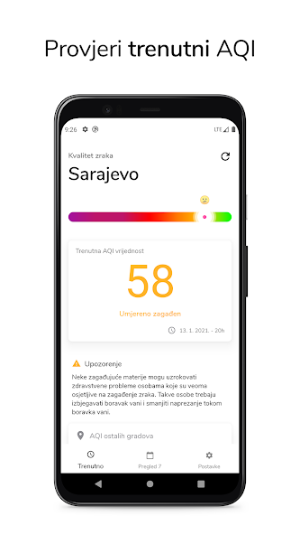 ค้นหามูลค่าปัจจุบันของดัชนีมลพิษทางอากาศสำหรับเมืองของคุณหรือดูการแสดงผลรายสัปดาห์ของค่า AQI แอปพลิเคชันนั้นฟรีและถูกสร้างขึ้นโดยมีจุดประสงค์เพื่อสร้างความตระหนักเกี่ยวกับอากาศที่ไม่ดีในบอสเนียและเฮอร์เซโกวีนา