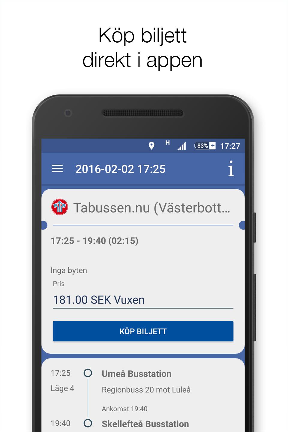 ในแอพคุณสามารถซื้อตั๋วมือถือสำหรับการเดินทางระยะสั้นและยาวในVästerbotten การชำระเงินที่ปลอดภัยทำด้วยบัตรธนาคารหรือใบแจ้งหนี้รายเดือน