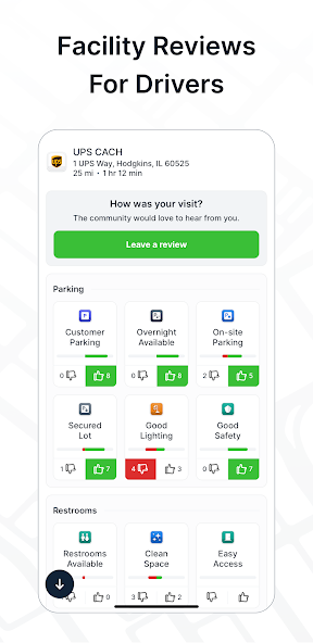 สถานที่กรองด้วย: ที่จอดรถ (กลางวัน, ค้างคืน, อันตราย), การล้างรถบรรทุก, ร้านขายของชำและร้านขายของชำ, น้ำมันดีเซล, ไบโอดีเซล, โพรเพน, เส้น def, เครื่องชั่งแมว, ท่ออากาศ, ตู้เอทีเอ็ม, ห้องน้ำ, ฝักบัว, ซักรีด, Wi-Fi