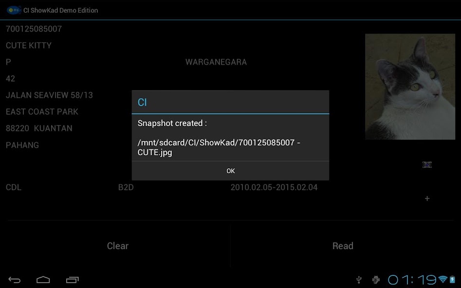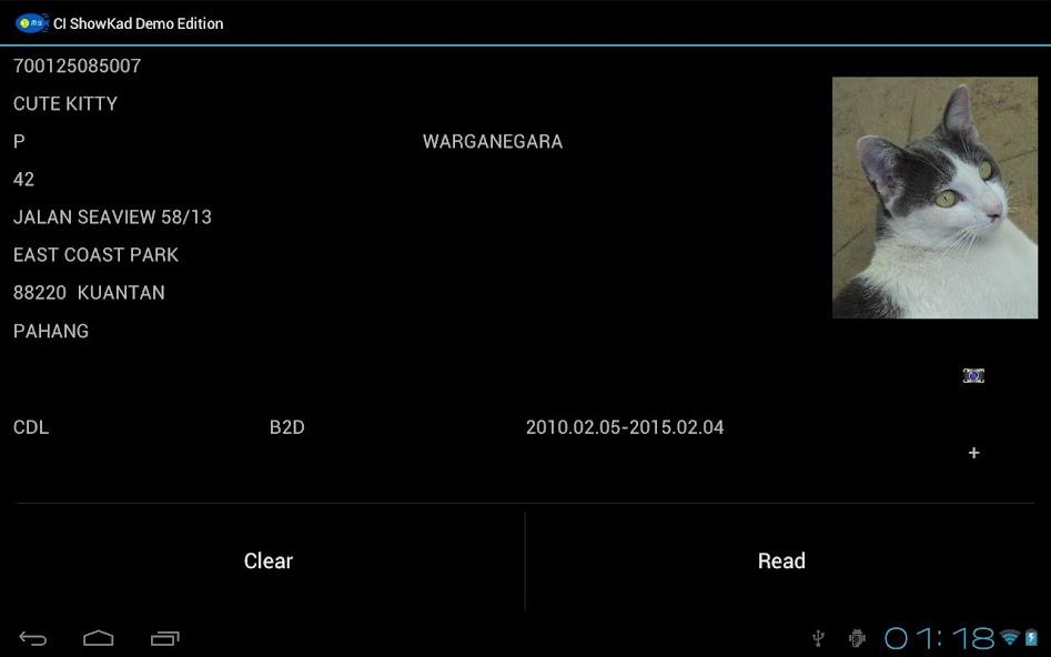 นี่คือฉบับสาธิตของ CI Showkad ช่วยให้ผู้ใช้ดูว่า CI showkad ทำงานอย่างไรและฟังก์ชันการทำงานโดยไม่มีเครื่องอ่าน SmartCard มันมีทุกอย่างที่ CI Showkad มีอยู่เพียงแค่แสดงเฉพาะ Mykad ของบุคคลที่สมมติขึ้น ข้อมูลที่แสดงรวมถึงหมายเลข IC, ชื่อ, เพศ, การเป็นพลเมือง, ที่อยู่, ภาพถ่ายและใบขับขี่ คุณสามารถติดตั้งและเรียกใช้ฉบับสาธิตนี้เพื่อสัมผัสกับประโยชน์ของ CI Showkad ด้วยตัวคุณเอง