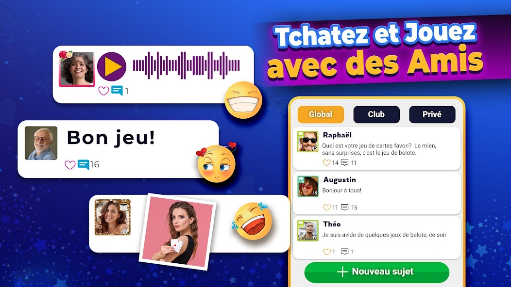 สร้างหรือเข้าร่วมชมรมสังคมหรือสโมสรต่อสู้! เป็นผู้นำเชิญเพื่อนของคุณเล่นเกม Belote ฟรีและรับประสบการณ์คลับ ยกระดับสโมสรของคุณ!