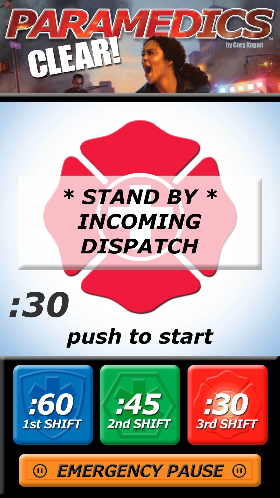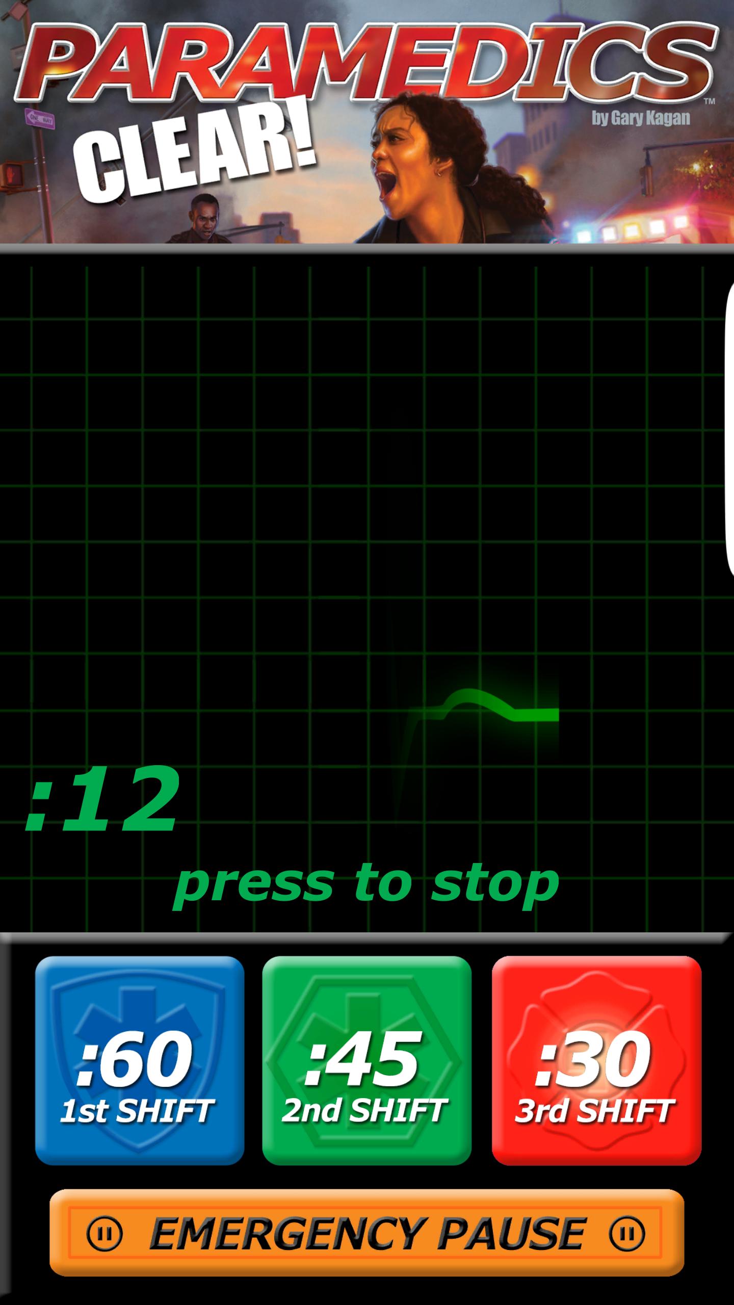 แอพสหายนี้สำหรับเกมกระดานพัลส์ PARAMEDICS: CLEAR! โดยเกม Smirk & Dagger (จำเป็นสำหรับการเล่น) มีตัวจับเวลาดิจิตอลสามตัวสำหรับการเปลี่ยนแปลงที่ยากลำบากตลอดเวลาซึ่งคุณกำลังแข่งเพื่อช่วยชีวิตให้มากที่สุดเท่าที่จะทำได้ จอภาพการเต้นของหัวใจกระตุ้นให้คุณรีบเร่งด้วยนาฬิกา 60, 45 หรือ 30 วินาทีนับลงไปเป็นเหตุฉุกเฉินหัวใจ - หรือถ้าคุณไม่เร็วพอ - โทนสีแบนของ DOA ทุกวินาทีนับ!
