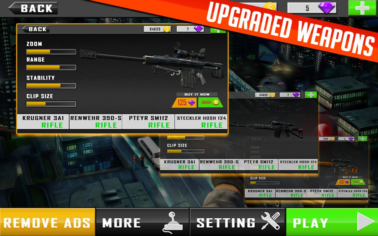 คุณพร้อมที่จะท้าทาย ??? ถ้าไม่ดูคลังแสงที่คุณให้ไว้ ปืนไรเฟิลซุ่มยิงล่าสุดพร้อมอุปกรณ์ทันสมัยที่ติดตั้งไว้ ฆ่าและได้รับรางวัลเพื่อให้คุณสามารถอัพเกรดอาวุธเป็นประจำ เลือกอาวุธที่เหมาะสมสำหรับระดับที่เหมาะสม