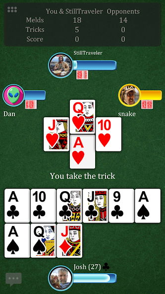 มาเล่น Pinochle - ผ่อนคลายวางกลยุทธ์การเสนอราคาผ่าน, Meld, ใช้กลอุบายเล็กน้อยและเพลิดเพลิน ท้าทายผู้เล่นจริงออนไลน์หรือฝึกฝนทักษะของคุณกับตัวละครคอมพิวเตอร์ที่ฉลาด ไม่ว่าคุณจะเป็น Pinochle Pro หรือเพิ่งเริ่มต้นเตรียมความพร้อมสำหรับความสนุกสนานและความตื่นเต้นที่ไม่มีที่สิ้นสุดในทุกเคล็ดลับ