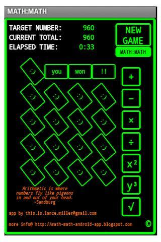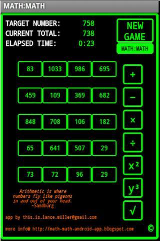 MATH:MATH สนุกและท้าทายมากกว่าการใช้เครื่องคิดเลขและนาฬิกาจับเวลา ปุ่มกดของตัวเลขถูกสร้างขึ้นแบบไดนามิกและแบบสุ่ม มันเป็นเหมือนการจัดการการ์ดแบบสุ่มเมื่อเล่นโป๊กเกอร์บางครั้งคุณได้รับการ์ด "ดี" และบางครั้งก็ไม่ได้มีประโยชน์ เช่นเดียวกับตัวเลขที่คุณมอบให้โดยเอ็นจิ้นเกม -คุณอาจไปถึงเป้าหมายใน 5 วินาทีหนึ่งเกมและเกมถัดไปอาจท้าทายมากขึ้นและใช้เวลา 10 นาที
