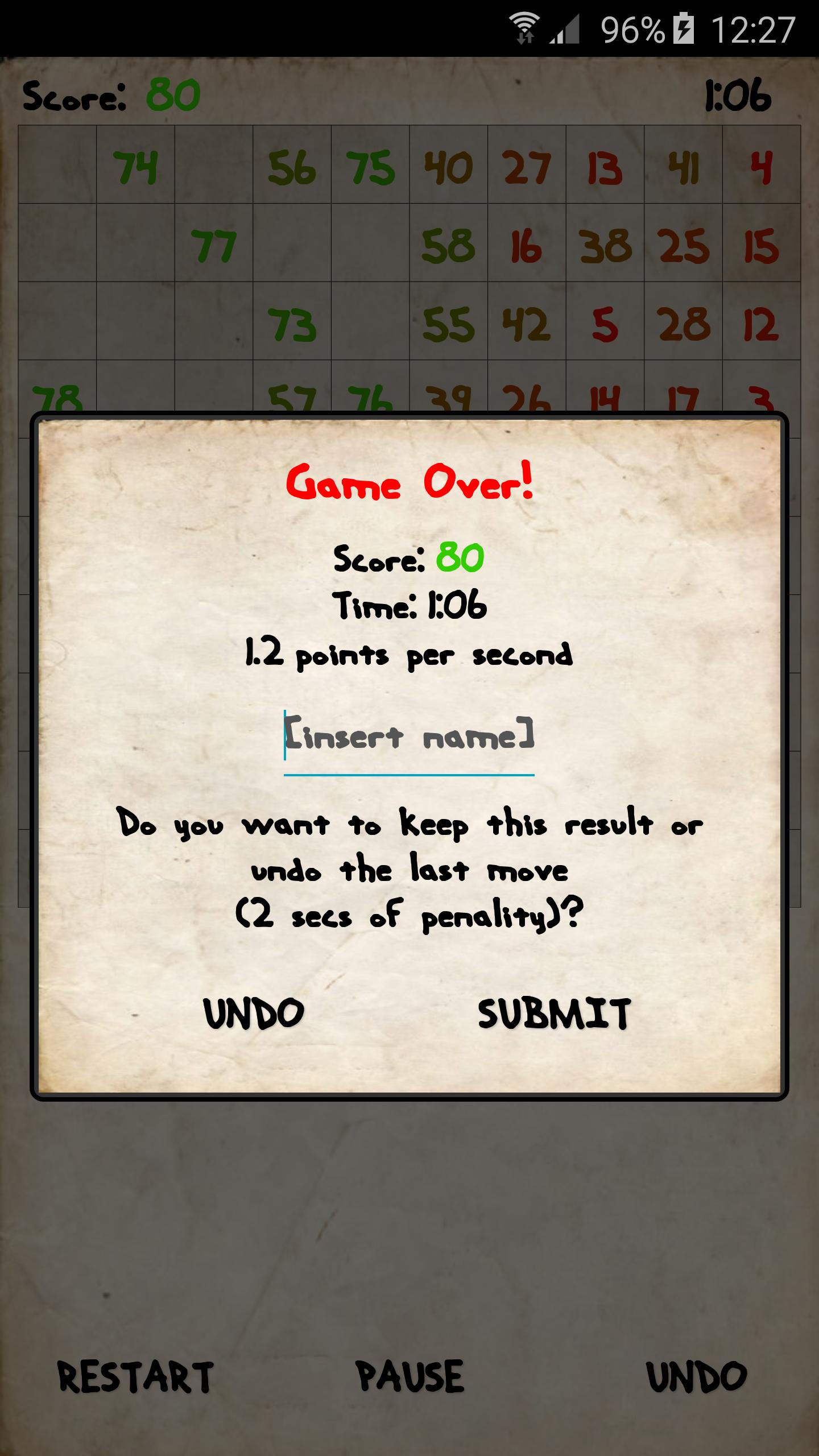 เกมสิ้นสุดลงเมื่อไม่อนุญาตให้มีการเคลื่อนไหวอีกต่อไปและคะแนนของคุณคือจำนวนที่คุณไปถึงในจุดนั้น นอกจากนี้คุณยังสามารถยกเลิกการย้ายครั้งสุดท้ายของคุณได้ตลอดเวลาที่คุณต้องการ แต่จะเพิ่มโทษ 2 วินาทีให้กับเวลาของคุณ