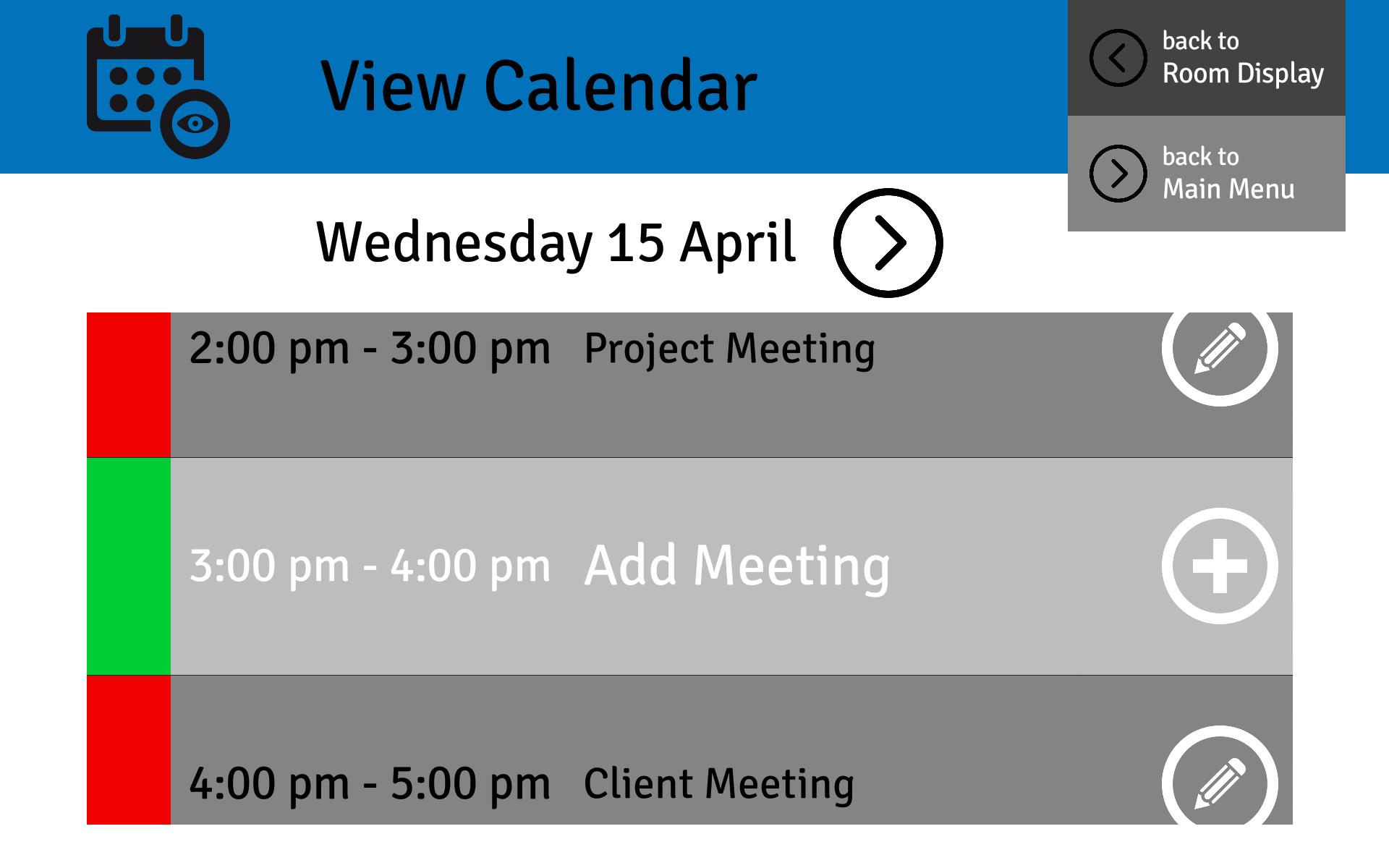 高度可自定义的主视图通过全屏颜色指示显示房间的状态。绿色表示可用,黄色显示未决的预订,红色意味着房间很忙。用户可以轻松地看到房间的状态,如果需要,会议组织者的名称。
