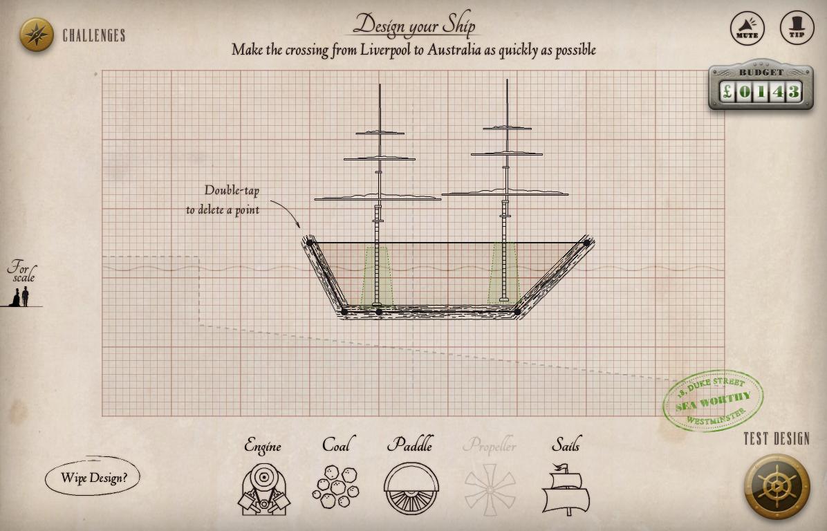 选择您的船体的船体材料(木材或铁),发动机,燃料和推进机制来克服布鲁内尔提出的挑战。您做的越好,投资者的信心越多,现金就会赚钱;为您提供更多的资金来设计更大更好的船只!