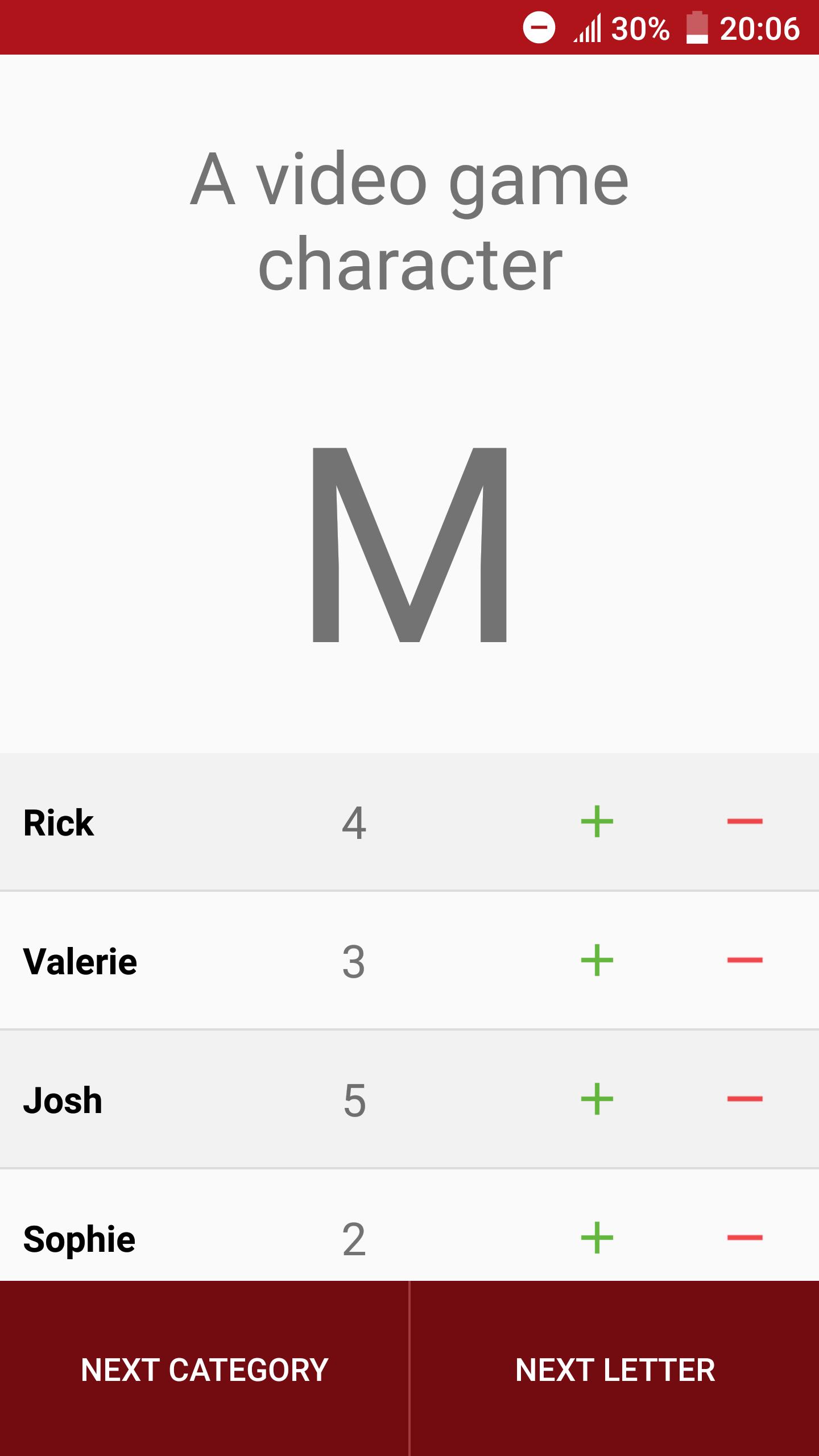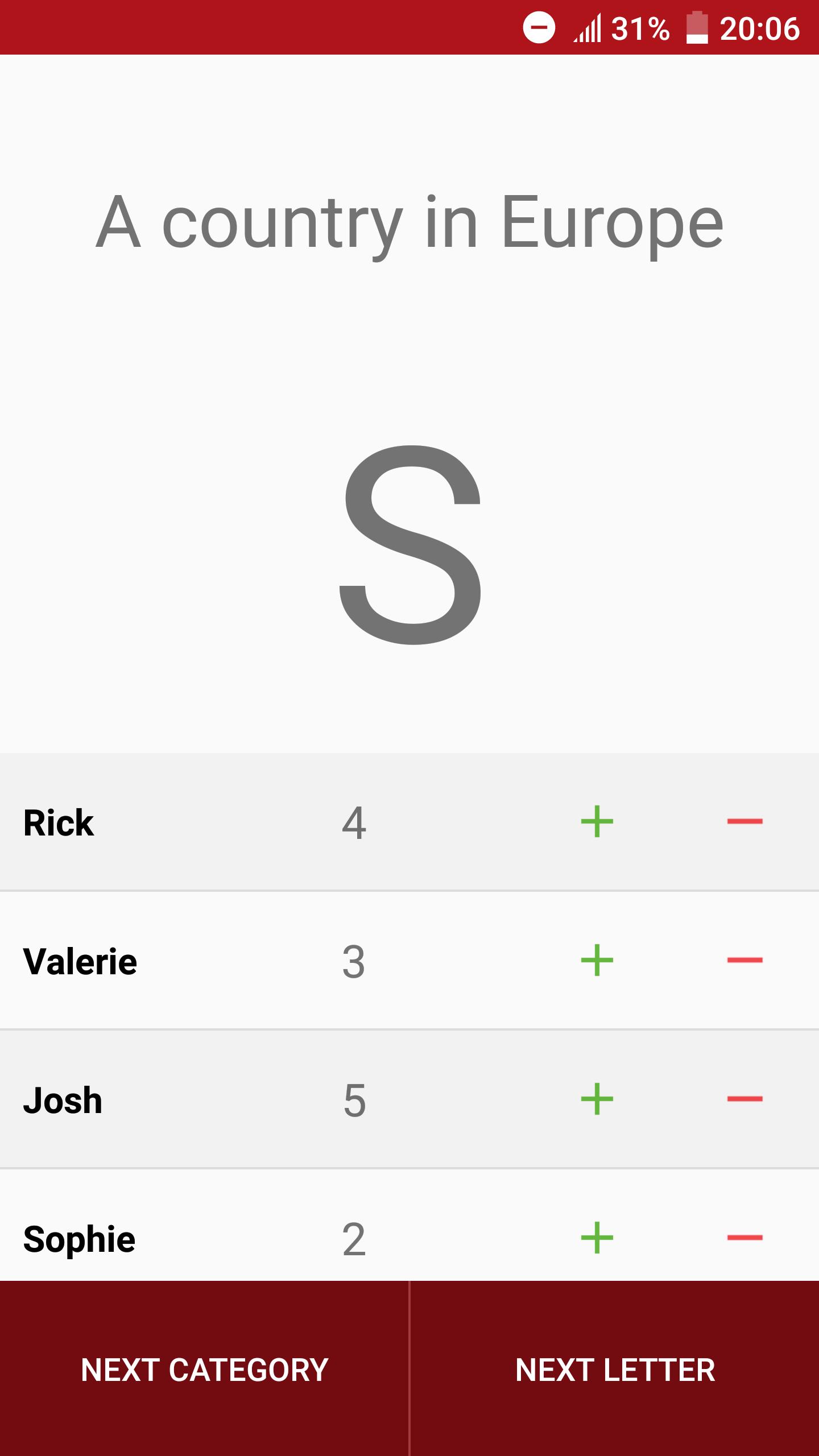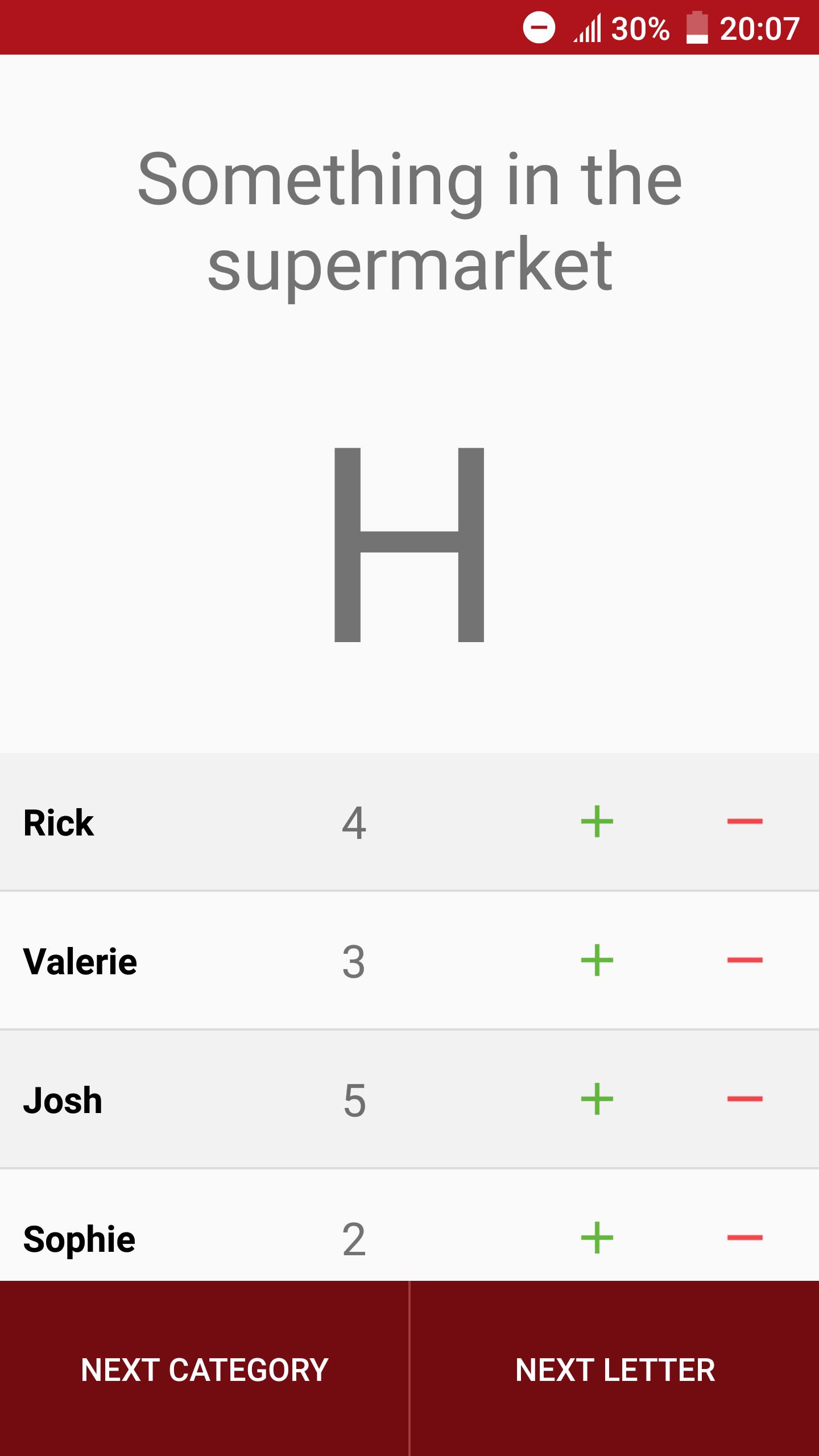 在此游戏中,您将获得一个随机字母和可以选择的两个类别。从给定字母开始的第一个构成选定类别中一个单词的人得分!您可以轻松地跟踪记分牌上的分数。与200多个类别无休止地玩!