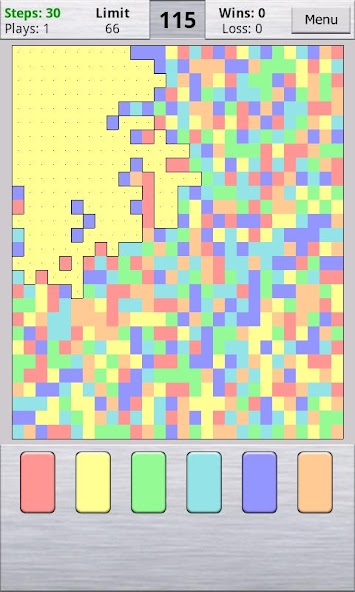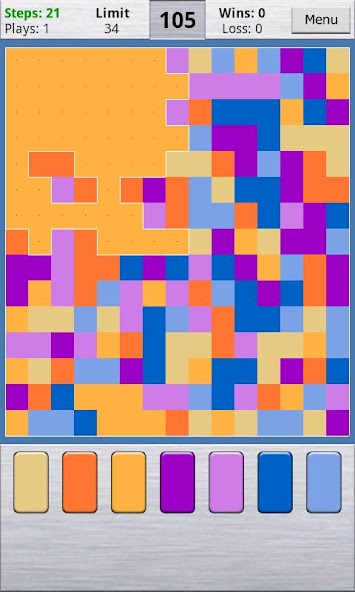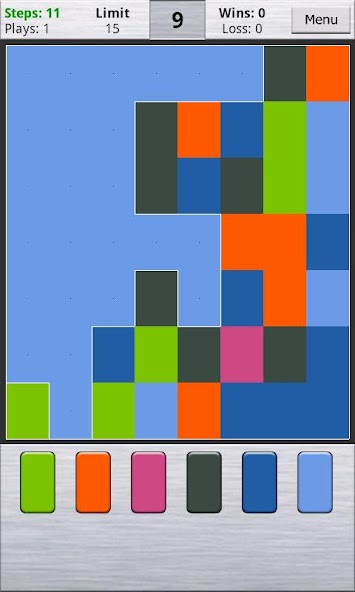 您从左上角开始级别。使用按钮选择一种新颜色。与所选颜色相邻的所有细胞都将添加到您的洪水区域中。当整板带有单个颜色时,水平就完成。如果您以少于允许的步骤填充板子,您将被移至一个新的级别。否则,您将提示重试,并且董事会将重新启动。