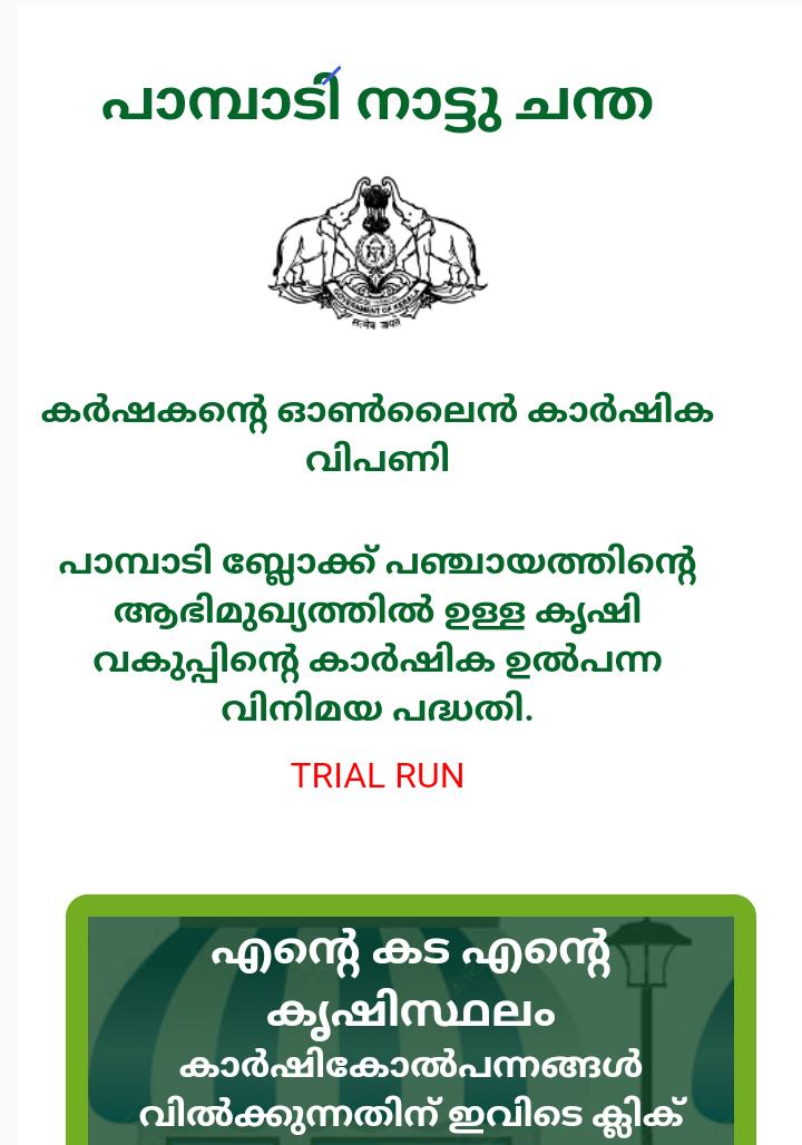 Pampady Market是喀拉拉邦的一個古老而著名的市場,允許農民出售其產品。現在,農業部和Kooeropada Block Panchayat現在創建了它的生產版本。這使農民可以在線列出他們的產品。提供從蔬菜到日記產品的產品。該項目的主要目的是幫助農民銷售其產品,並幫助公眾免費獲得新鮮和農藥,自製蔬菜和其他產品