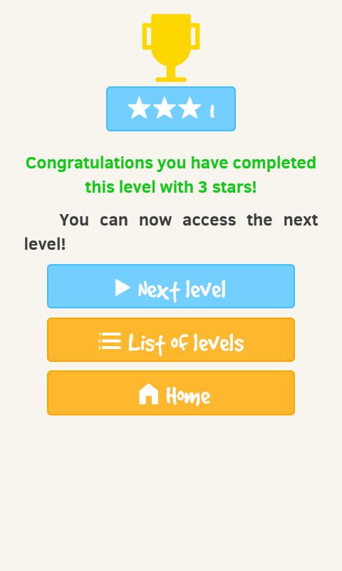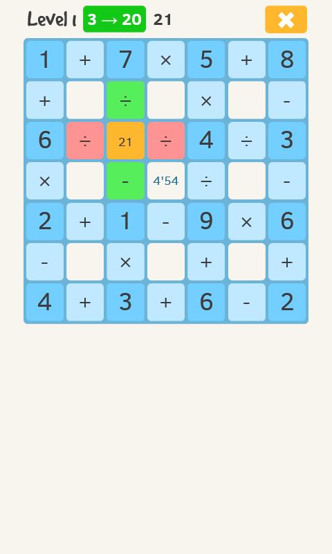 給您一個初始數字,並且,通過在其旁邊的瓷磚上移動橙色瓷磚,您可以更改計數器的值,直到達到目標編號為止。由於運營商和數字更改,您可以更改值。您的動作越少,每個級別的星星就越多。要小心,因為時間用完了,您將失去遊戲...