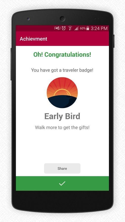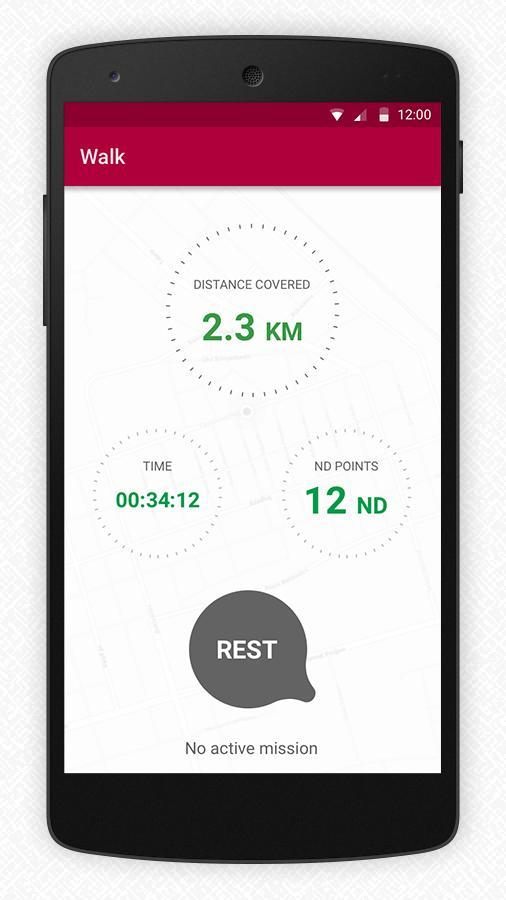 單擊“啟動”後,程序將計算您的旅行距離和時間。通過單擊休息,計算停止。對於每次通過的100米,您將獲得1位。