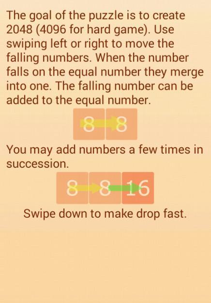 難題的目的是創建2048年(硬遊戲4096)。使用左右滑動以移動下降數字。當數字屬於等量的數字時,它們合併為一個。下降數字可以添加到相等的數字中。您可以連續添加幾次數字。向下滑動以使下降快速。